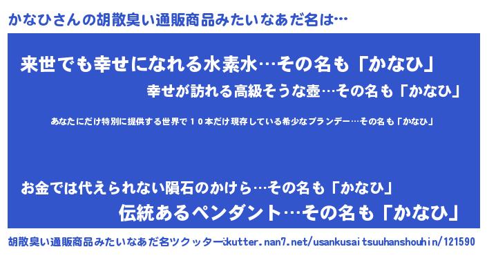 | 男性向けラノベタイトル風あだ名 | 『この素晴らしい世界にかなひを!』 |