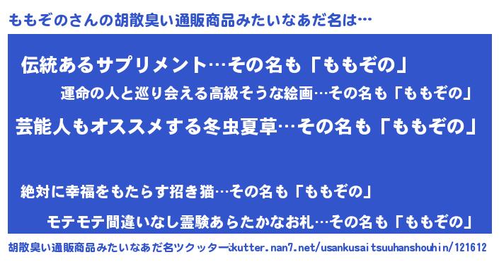| 男性向けラノベタイトル風あだ名 | 『Re:ももぞのから始める異世界生活』 |