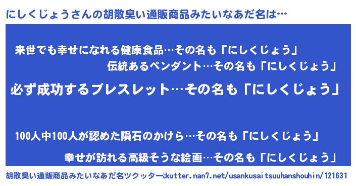 | 男性向けラノベタイトル風あだ名 | 『ニシクジョウスレイヤー』 |