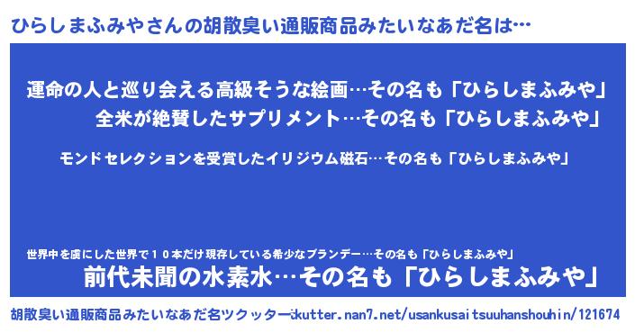 | 男性向けラノベタイトル風あだ名 | 『ノーゲーム・ノーヒラシマフミヤ』 |
