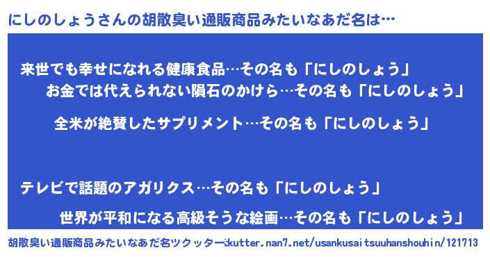 | 男性向けラノベタイトル風あだ名 | 『にしのしょうの嫁は女の子じゃないと思った?』 |