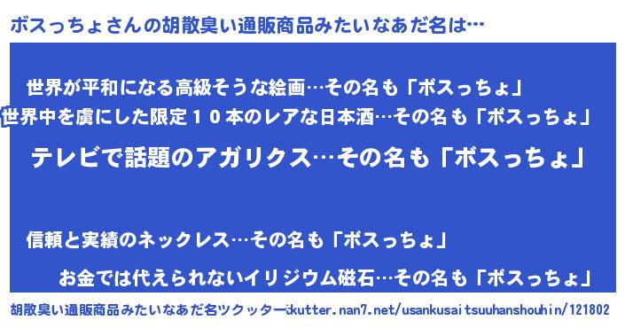 | 男性向けラノベタイトル風あだ名 | 『転生したらボスっちょだった件』 |