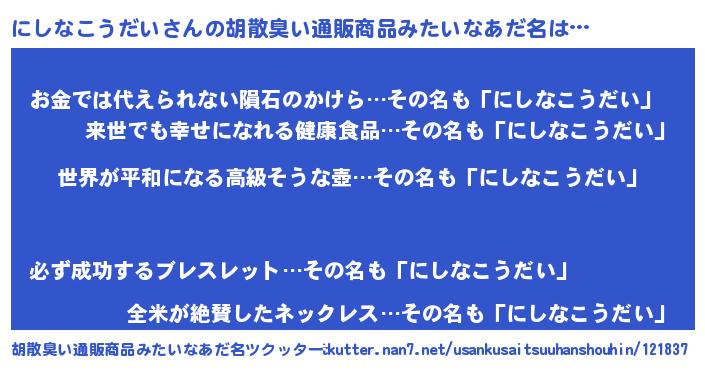 | 男性向けラノベタイトル風あだ名 | 『転生したらにしなこうだいだった件』 |