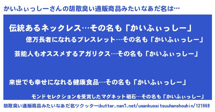 | 男性向けラノベタイトル風あだ名 | 『うちのかいふぃっしーが世界を掌握している!』 |