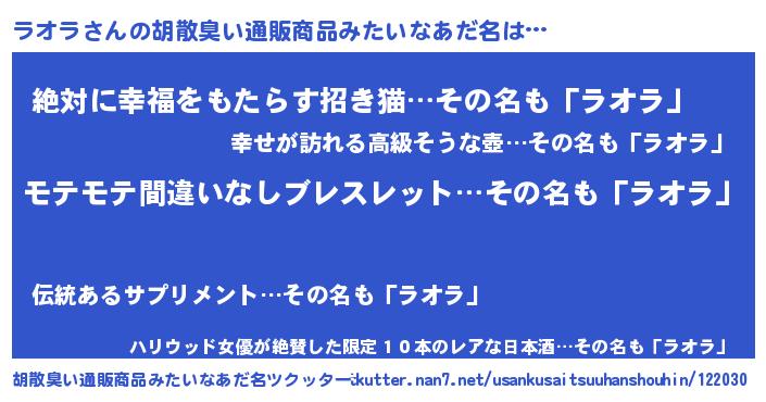 | 男性向けラノベタイトル風あだ名 | 『ラオラアートオンライン』 |