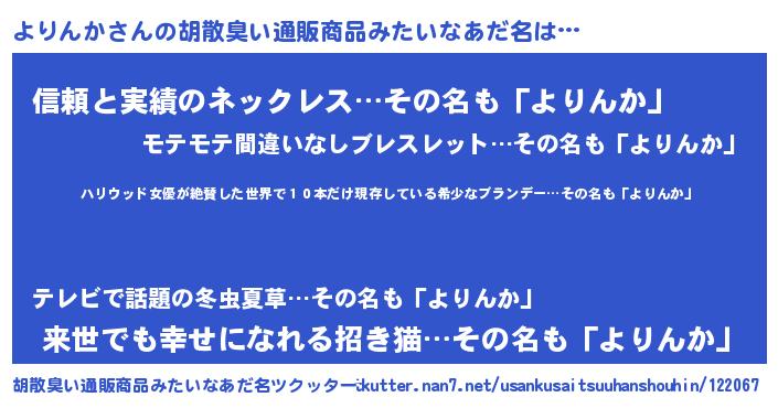 | ヘコむあだ名 | 『よりぷりん』『よりんか(笑)』 |