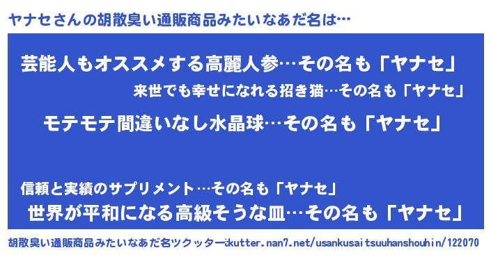 | 恥ずかしいあだ名 | 『プリティーヤナセ』『ヤナセデラックス』 |