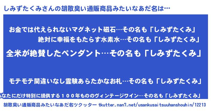 | 男性向けラノベタイトル風あだ名 | 『うちのしみずたくみが世界を掌握している!』 |