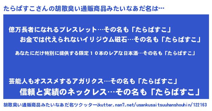 | 意味不明あだ名 | 『住所不定無職たらばすこ(56歳)』 |