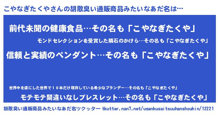 | 意味不明あだ名 | 『とにかく怪しいこやなぎたくや』 |