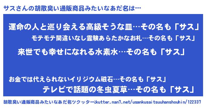 | 男性向けラノベタイトル風あだ名 | 『転生したらサスだった件』 |