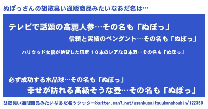 | 男性向けラノベタイトル風あだ名 | 『ヌポッスレイヤー』『魔弾の王とぬぽっ』 |