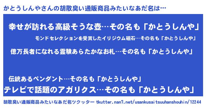 | 肩書あだ名 | 『かとうしんや少将』『かとうしんや機長』 |