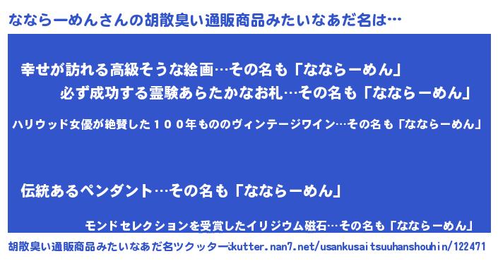 | 男性向けラノベタイトル風あだ名 | 『緋弾のナナラーメン』 |