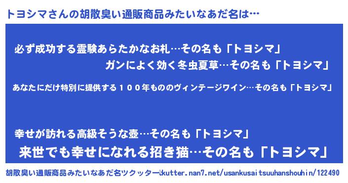| 男性向けラノベタイトル風あだ名 | 『トヨシマ~年齢イコール彼女いない歴の魔法使い~』 |
