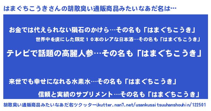 | ロボットアニメ | 搭乗するロボットの名前『はまぐちこうきグァンダム初号機』 |