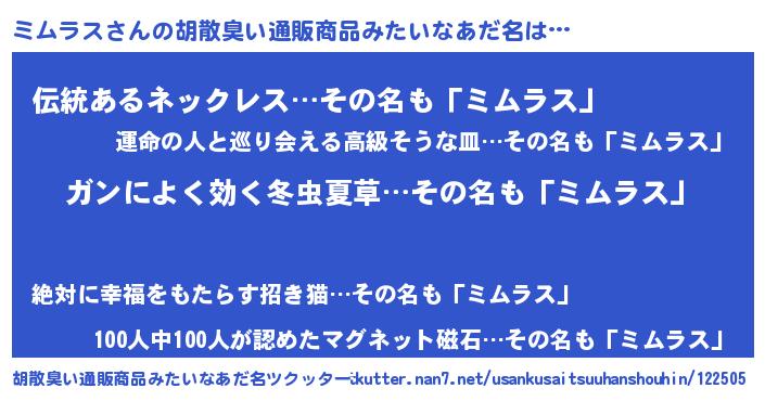 | 男性向けラノベタイトル風あだ名 | 『緋弾のミムラス』『ミムラススレイヤー』 |