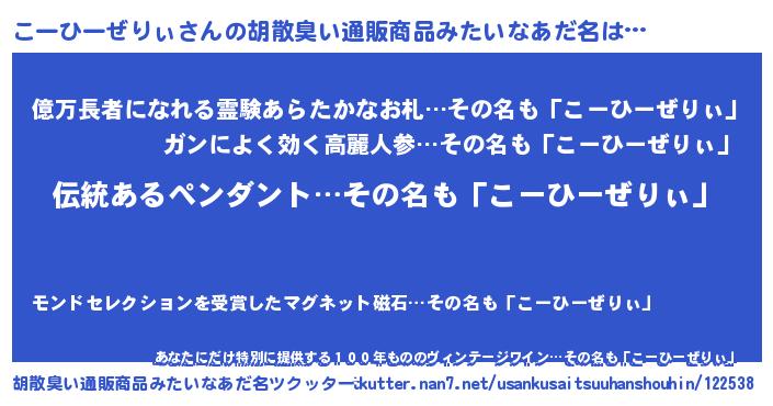 | 男性向けラノベタイトル風あだ名 | 『こーひーぜりぃの嫁は女の子じゃないと思った?』 |