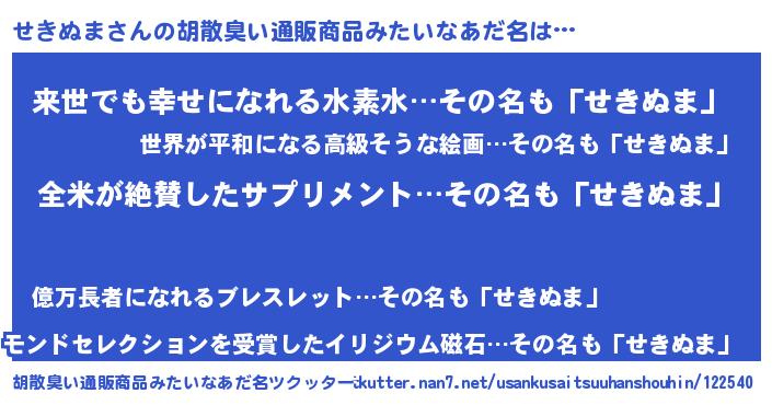 | 男性向けラノベタイトル風あだ名 | 『せきぬまの嫁は女の子じゃないと思った?』 |