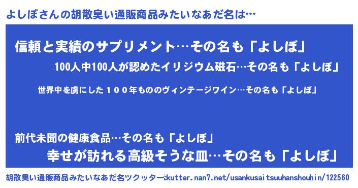 | 意味不明あだ名 | 『住所不定無職よしぼ(2歳)』 |