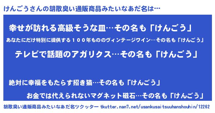 | ヘコむあだ名 | 『豆乳』『けんごう(苦笑)』『けんを』 |