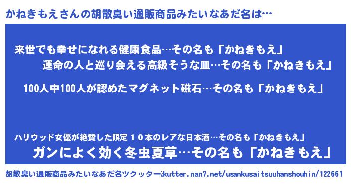 | ヘコむあだ名 | 『かねきもえ(笑)』『酢こんぶ』 |