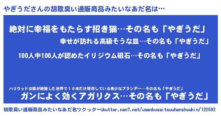 | ヒーロー風カッコイイあだ名 | 『友情の使者やぎうだ』『ネオヤギウダ』 |