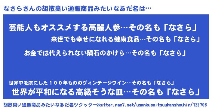 | ヘコむあだ名 | 『なまこ酢』『なさら(笑)』 |