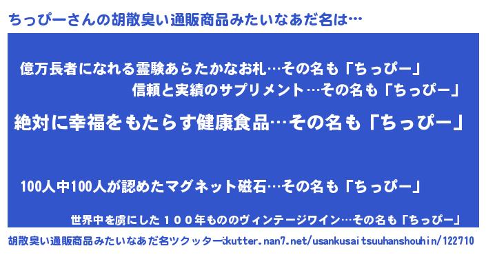 | 女子向けラノベタイトル風あだ名 | 『異世界で失敗しない100のちっぴー』 |