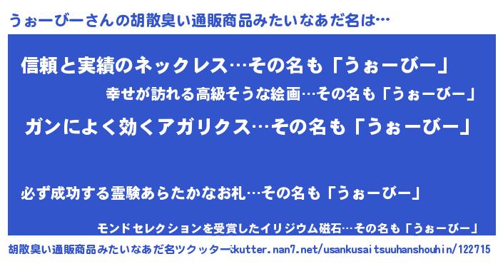 | 女子向けラノベタイトル風あだ名 | 『うぉーびーなんてお断りですっ。』 |