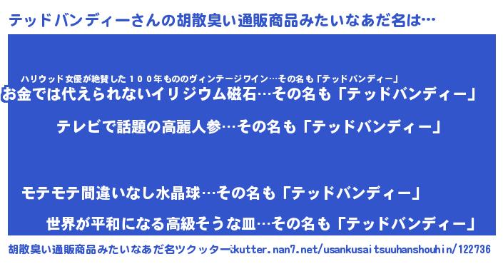 | 女子向けラノベタイトル風あだ名 | 『テッドバンディーの玉の輿計画!』 |