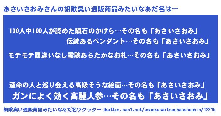 | ヘコむあだ名 | 『あさっふぃ~』『あさぷりん』 |