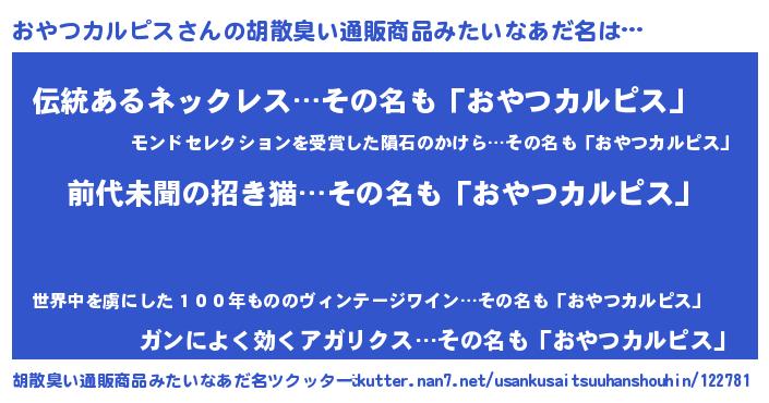 | 男性向けラノベタイトル風あだ名 | 『うちのおやつカルピスが世界を掌握している!』 |