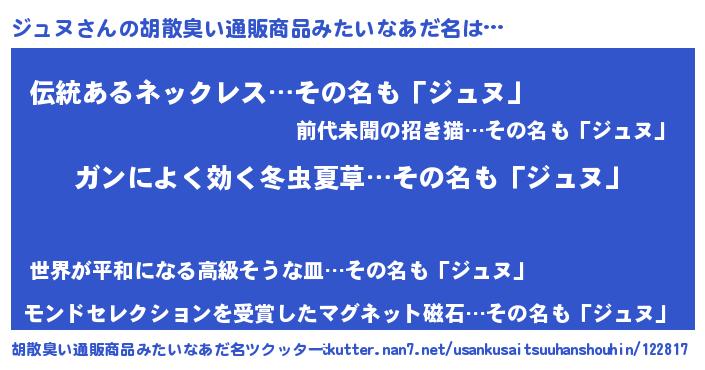 | ヘコむあだ名 | 『ジュっぺ』『ジュヌ(笑)』 |