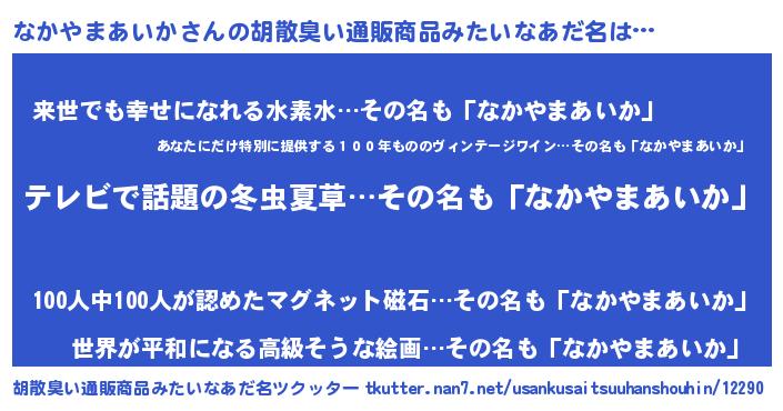| ヘコむあだ名 | 『なかやまあいか(苦笑)』『なまこ酢』 |