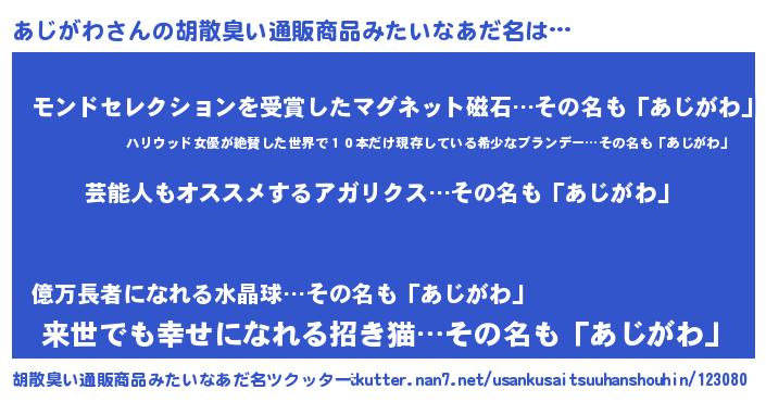 | 意味不明あだ名 | 『自称あじがわ』『永久保存あじがわ』 |
