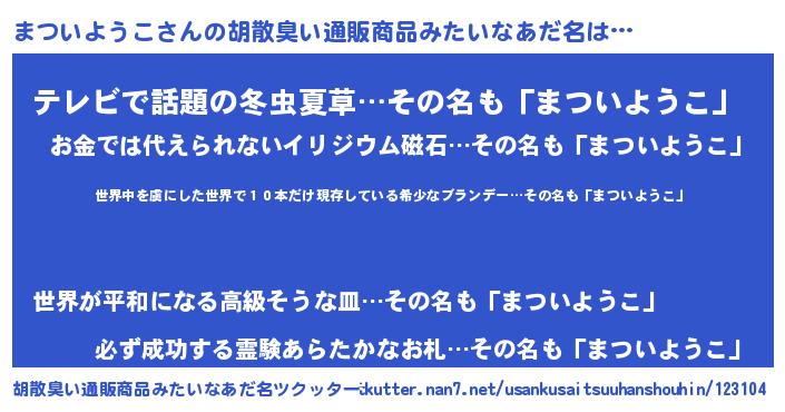 | 男性向けラノベタイトル風あだ名 | 『魔弾の王とまついようこ』 |