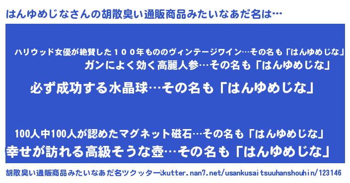 | 男性向けラノベタイトル風あだ名 | 『はんゆめじなの憂鬱』 |