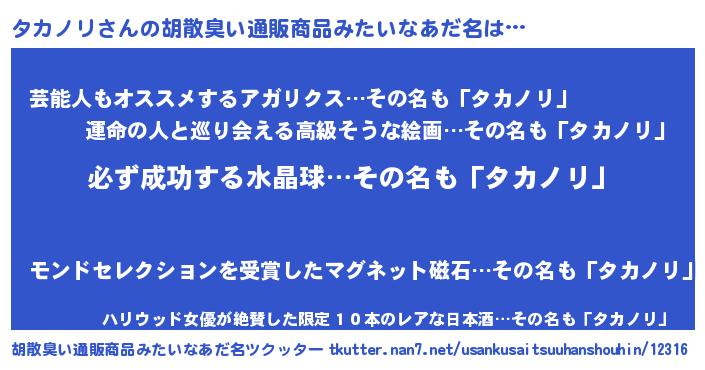| ヘコむあだ名 | 『タカにゅー』『酢こんぶ』 |