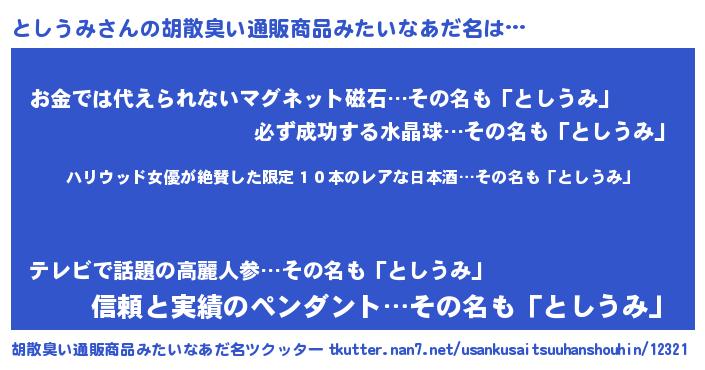 | 意味不明あだ名 | 『住所不定無職としうみ(47歳)』 |