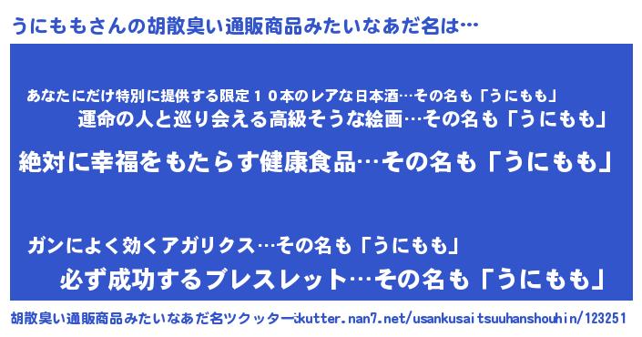 | 男性向けラノベタイトル風あだ名 | 『緋弾のウニモモ』『うにももの憂鬱』 |
