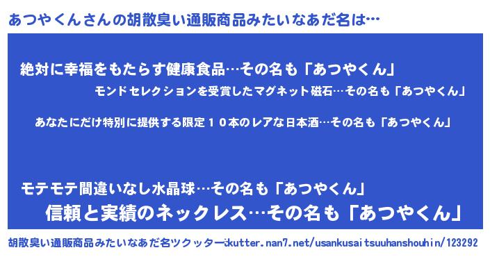 | 男性向けラノベタイトル風あだ名 | 『この素晴らしい世界にあつやくんを!』 |