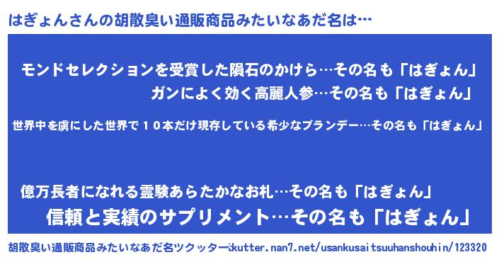 | 意味不明あだ名 | 『住所不定無職はぎょん(95歳)』 |