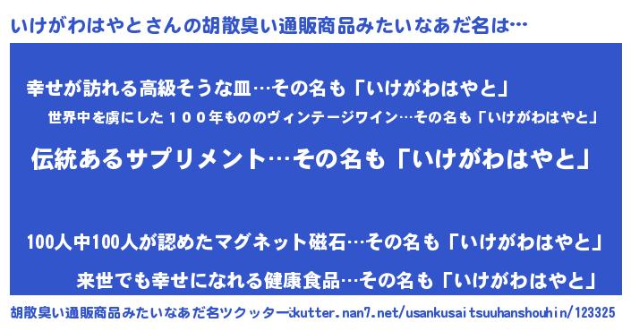 | 男性向けラノベタイトル風あだ名 | 『転生したらいけがわはやとだった件』 |
