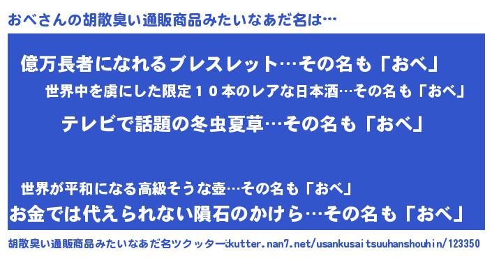 | 男性向けラノベタイトル風あだ名 | 『Re:おべから始める異世界生活』 |