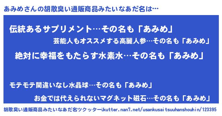 | 男性向けラノベタイトル風あだ名 | 『あみめという概念が存在しない退屈な世界 』 |