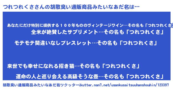 | 男性向けラノベタイトル風あだ名 | 『つれつれくさの憂鬱』 |