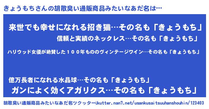 | ヘコむあだ名 | 『きょうもち(笑)』『きょお』『豆乳』 |