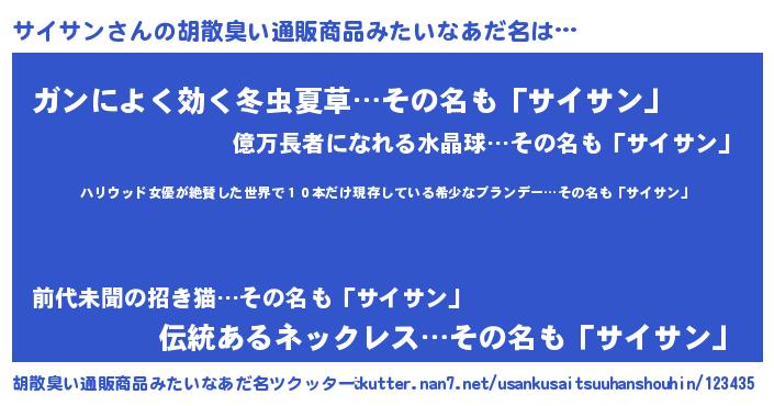 | 意味不明あだ名 | 『住所不定無職サイサン(98歳)』 |