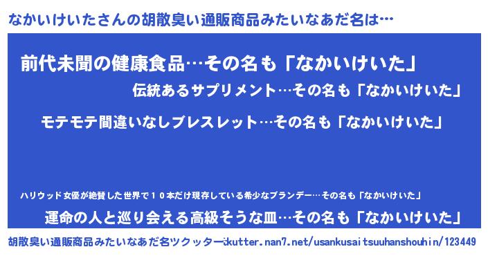 | 男性向けラノベタイトル風あだ名 | 『ナカイケイタアートオンライン』 |